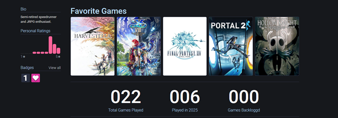 I believe that any good art form deserves to be criticized, but also that if I don't log the games that I play then I'll often forget them entirely. Backloggd fills both of those needs.